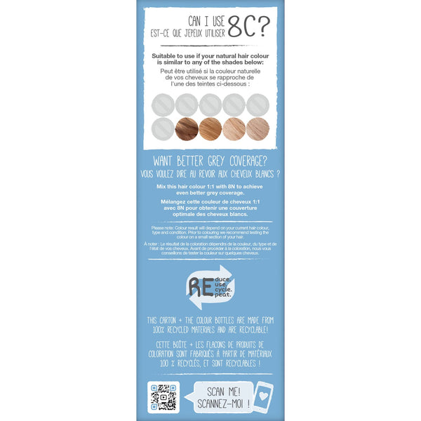 Tints of Nature 8C Ash Blonde home hair dye has been carefully developed with over 75% certified organic and 95% naturally derived ingredients, to gently nourish and protect your hair for gentle, home hair colouring. Tints of Nature 8C will provide maximum colour performance and up to 100% grey coverage and give long lasting results.At Tints of Nature we make sure all of our permanent home hair colours contain the lowest possible levels of PPD and remain ammonia, paraben and resorcinol free, so your hair can look and feel gorgeously healthy. Tints of Nature blonde permanent hair dyes will lift your base hair colour by one shade, for further lift shop for our Tints of Nature Highlight and Lightener Kits.